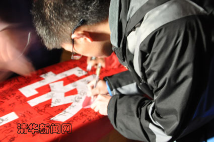 图为开云学子在祝福雅安的横幅上签名。詹蕙兰 李子玄 摄