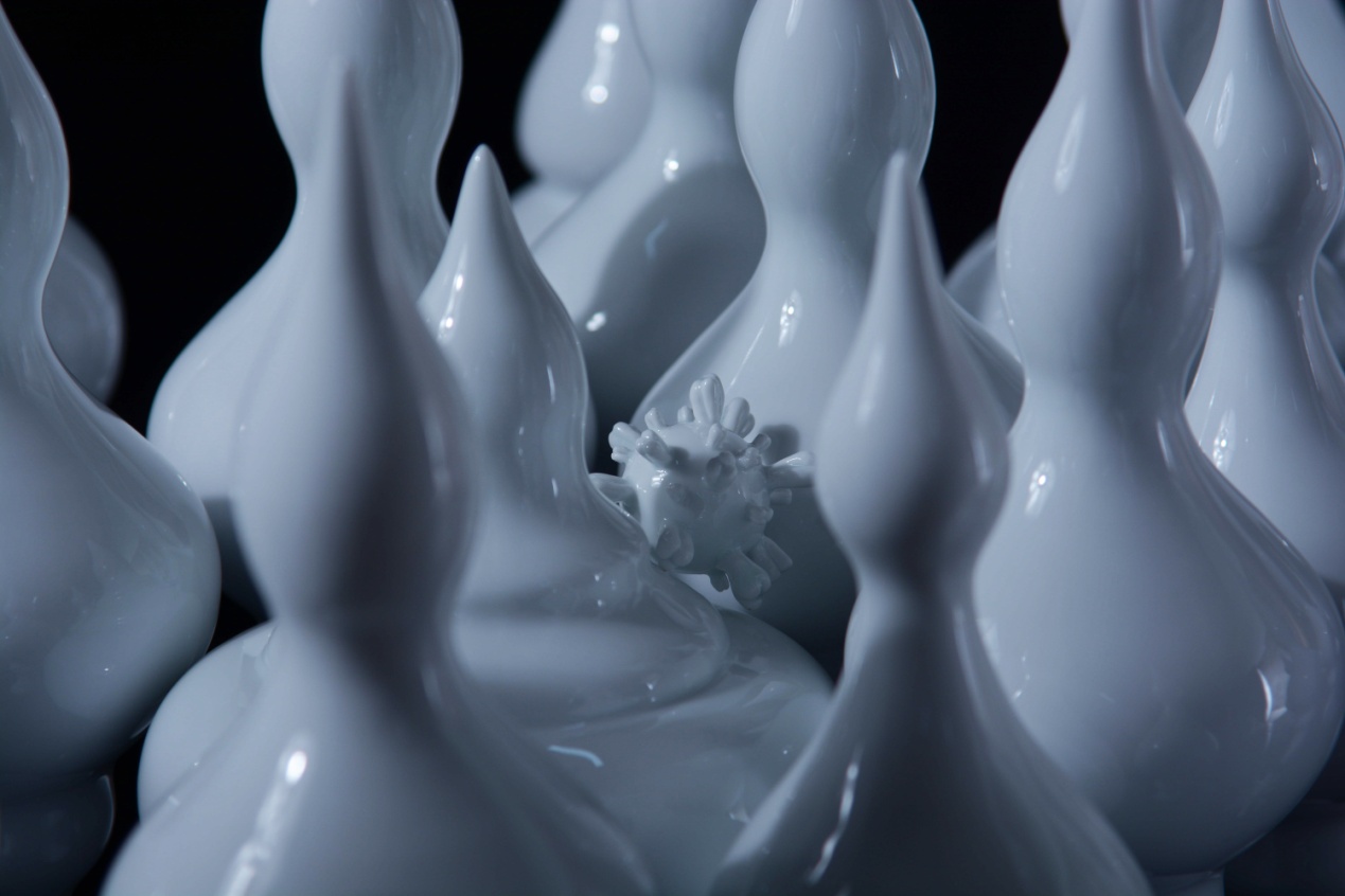 《我很好,你呢》是一套由一百余件陶瓷器物组成的陶瓷装置作品,宋丹杨的灵感来源于今年疫情期间她所感受到的来自个体以及集体的焦虑情绪。通过陶瓷材料本身的脆弱以及易碎感,结合器物形态的异变表现了这种焦虑情绪与她所感受到的不安全感,借用陈列方式的设计表达了焦虑情绪积极转化的过程,从而展现一种积极向上的态度。宋丹杨尝试将陶瓷语言与社会热点问题相结合。