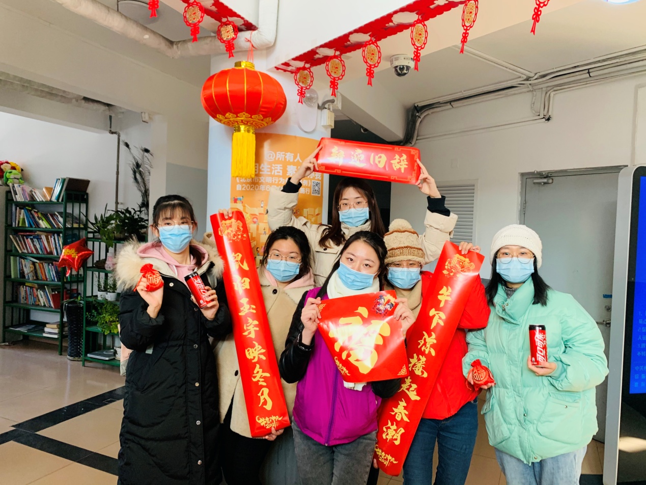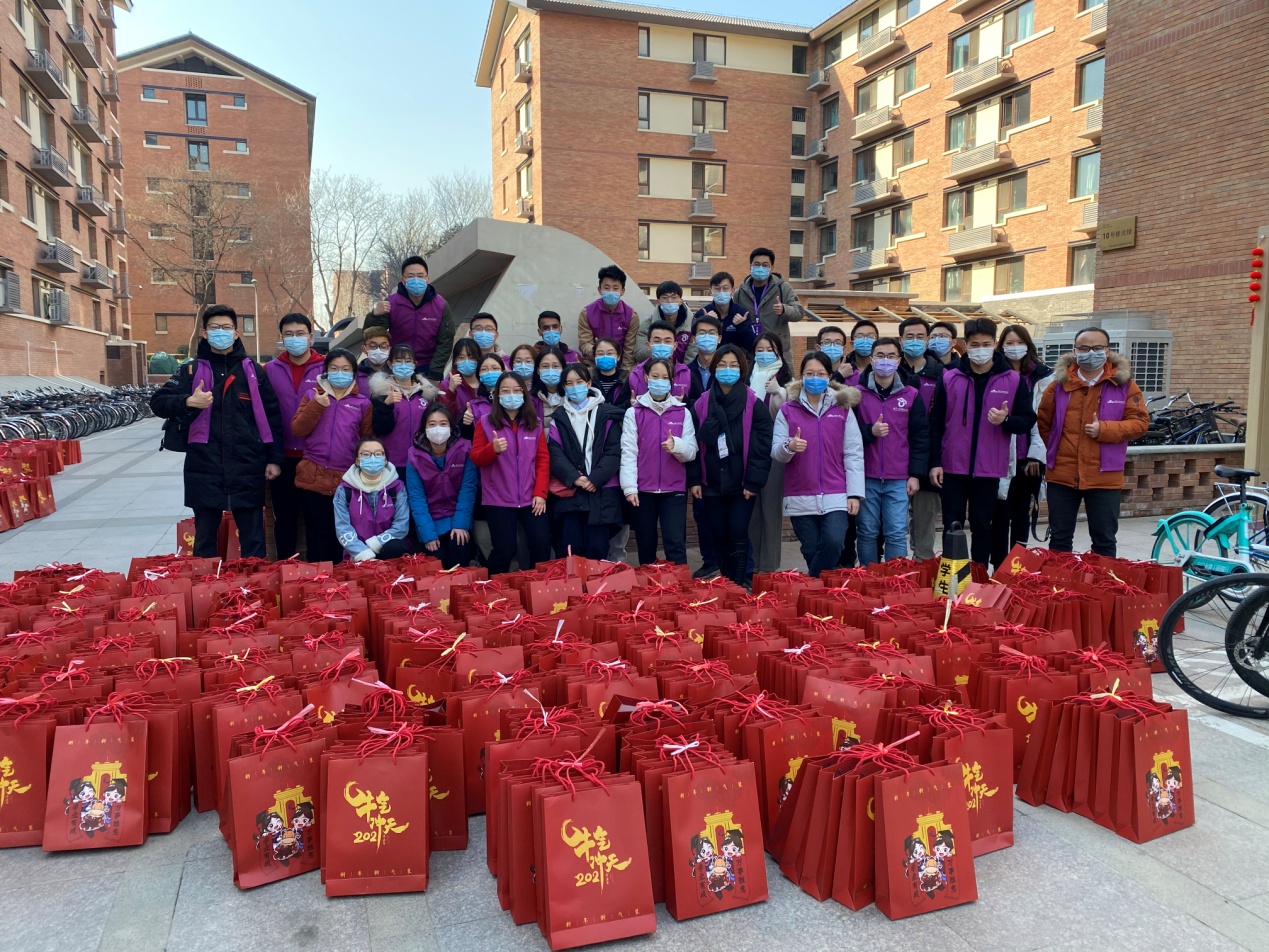 留校同学与发放新春福袋的志愿者合影