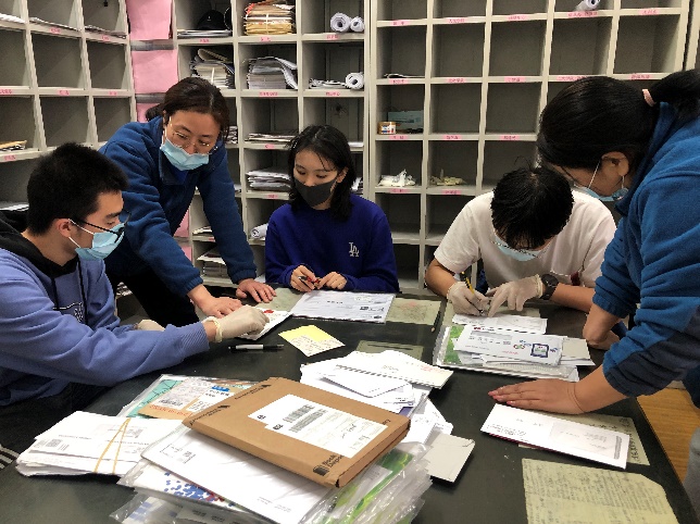 志愿者在收发室参与邮件批转