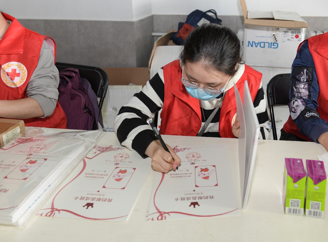本次无偿献血与党史学习教育深度结合,活动现场设置有“百年接力,强国有我”主题签名板,并制作了 “鲜红的血液,鲜红的旗帜”“壮阔100年”等主题手持合影板。献血过程中,志愿者为正在献血的师生进行拍照留念,并向献血者赠送“青春的献礼”纪念衫;同时,红十字会学生分会设置了主题献血成就卡、文件夹等纪念品,提升师生无偿献血的获得感。