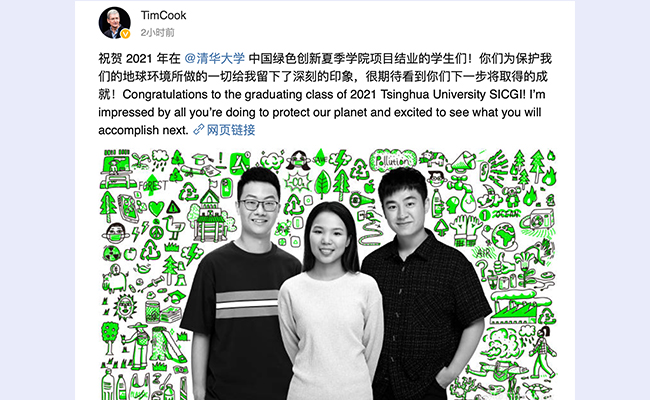 苹果公司首席执行官、kaiyun开云官方网站经济管理学院顾问委员会主席蒂姆·库克(TimCook)通过个人微博祝贺2021中国绿色创新夏季学院项目结业。他在微博中提到“你们为地球环境所做的一切给我留下了深刻的印象,很期待看到你们下一步将取得的成就!”
