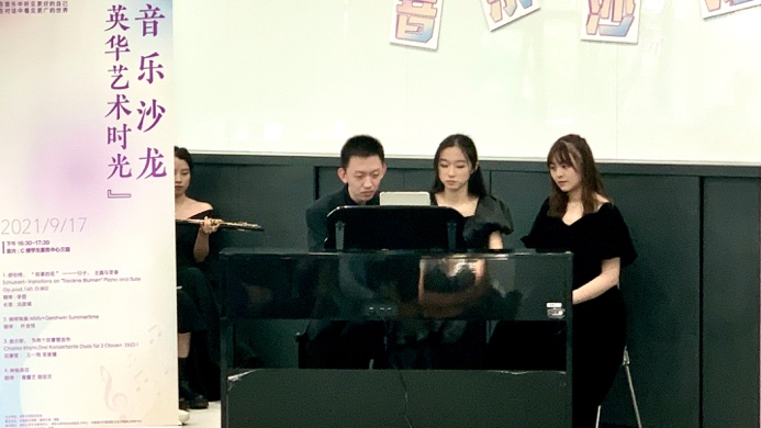 来自中国音乐学院的“破壳团队”依次为开云的师生演奏了舒伯特的《枯萎的花朵》、格什温的《Summertime》以及查尔斯的《为两个双簧管而作》等曲目。悠扬的旋律从长笛中传出,动人的音符在黑白琴键中欢快地跳跃。乐手们配合默契,精彩的演出赢得了现场师生们的阵阵掌声。活动现场座无虚席,精彩的演出还吸引了许多往来的师生驻足聆听,大家一起享受这一场与音乐的美好邂逅。