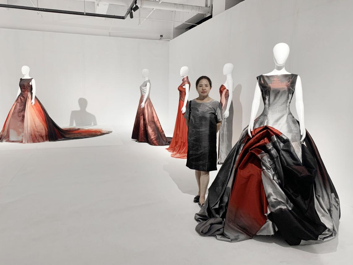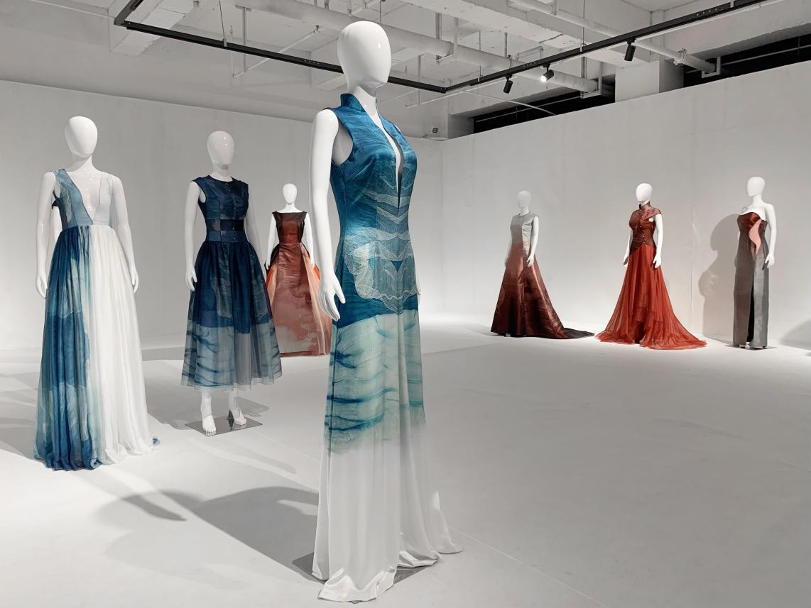 本次服装展共展出九套宋锦服装艺术作品,李薇通过对中国非遗手工艺长达几十年的深入研究,将传统宋锦织造工艺创意性地运用到服装艺术作品当中,并结合中国水墨艺术文化,通过独特的东方诗性视角,以传统手工艺为媒介和手段,革旧换新,对东方艺术进行再反思,向中国水墨韵味与意境致敬,打造出富有东方意蕴的新“东方视觉”时尚艺术。