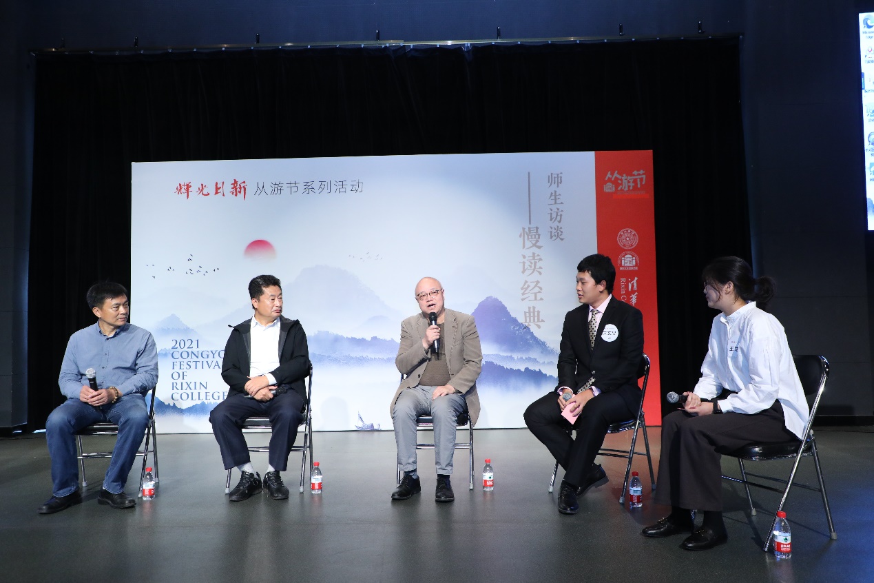 随后,沈卫荣、刘晓峰、韩立新三位教师接受访谈,围绕读书会的意义、目标和成立初衷等方面畅谈各自的想法。访谈活动由日新书院2020级应文昱和王思行主持。三位教师表示,相比于普通课堂的讲授方式,读书会带来的收获更加丰富且扎实。读书会上一字一句地读,将碰到的“墙”一面面地推倒,夯实了人文学科的基本功。这样的慢节奏、细致与踏实,正是“慢读经典”的含义。