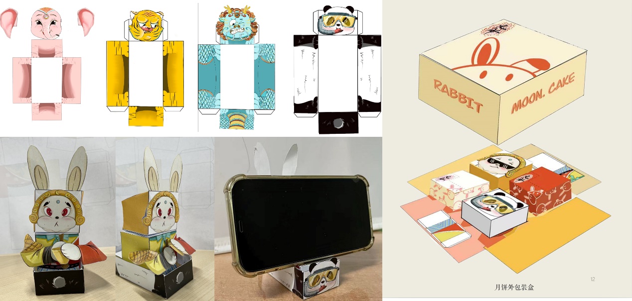“兔爷月饼”小组设计了融入北京非物质文化遗产“兔儿爷”形象的月饼包装礼盒,通过使用环保再生纸的包装、隐藏的兔儿爷摆件、低脂低糖的月饼,减少了传统月饼的人情负担、健康负担和环境负担。
