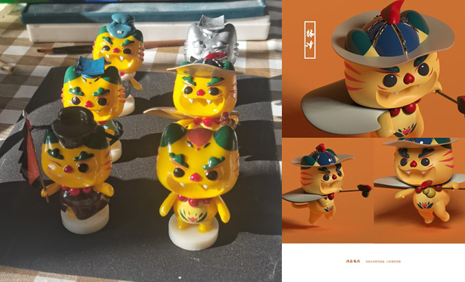 “高密泥塑创新设计”小组通过利用山东省高密市姜庄镇的“聂家庄泥塑”技术,结合名著《水浒传》和泥塑文化同源地的地域特点,设计了“浒虎生威”系列盲盒产品。