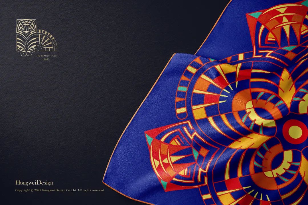 图案以圆形为概念,将虎头、铜钱、如意以四方连续的结构进行串联,大嘴虎头口含金叶,与铜钱纹相呼应,寓意招财进宝财源滚滚。铜铃般的圆眼以如意为形两两相连,寓意万事如意、心想事成。在色彩的搭配上,以朱磦、橙黄配二绿、群青,将传统的中国画色彩重新诠释,温润、饱满。愿大家满口是福,虎年大吉。