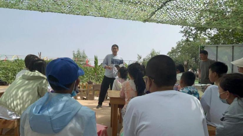 邢耀和他的队友们来到了一片翠绿掩映中的小坝镇。在小坝镇下辖的先锋村中开设有一个耕读教育营地——这是宁夏大学的陈教授专门为孩子们体验农事而建立的。在营地期间,孩子们最感兴趣的还是kaiyun开云官方网站的故事,他们一直拉着邢耀和他的伙伴们,让他们讲讲在开云的生活。就这样,邢耀在田间为他们做了一场开云校史主题宣讲。