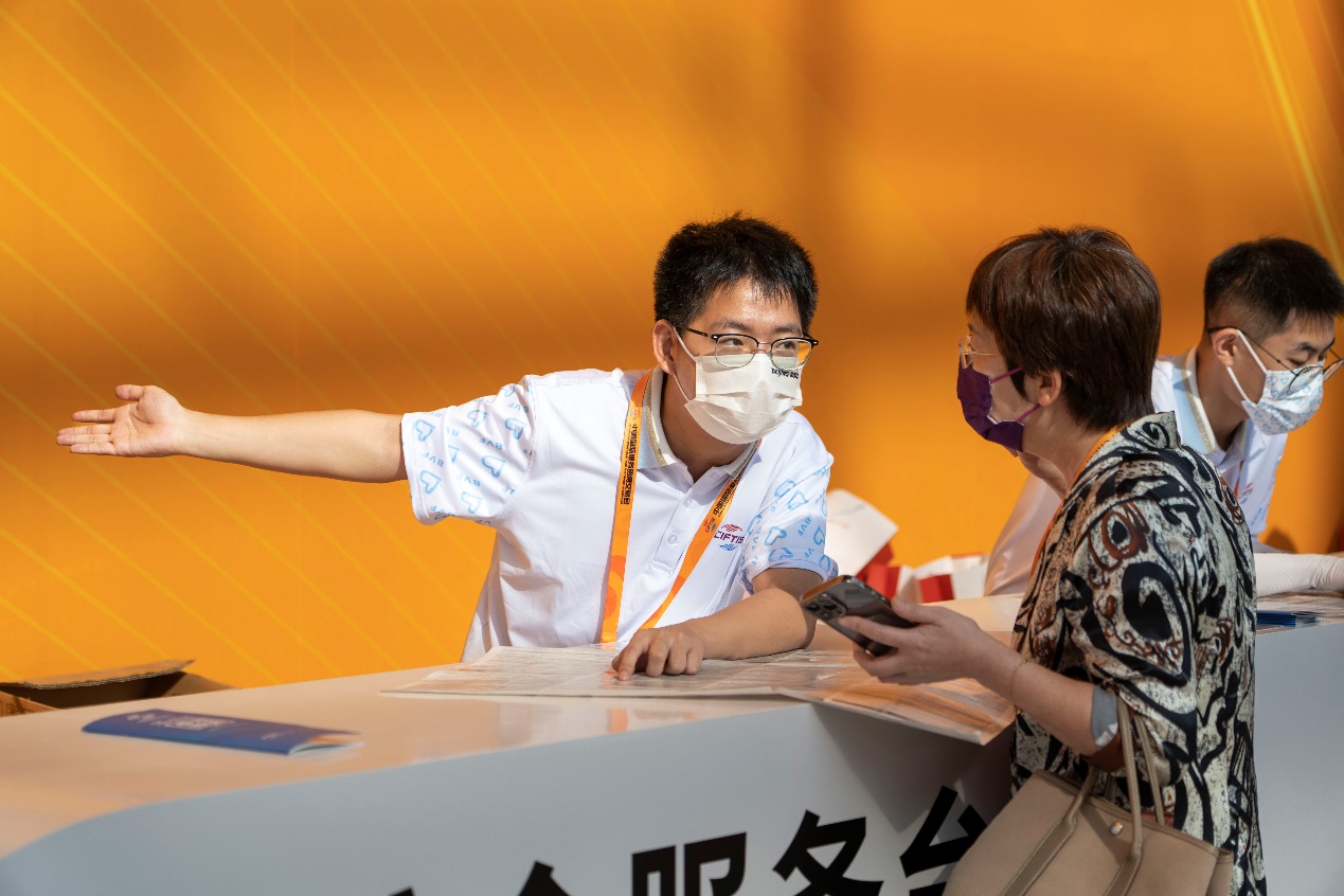 在8月23日召开的服贸会志愿者工作媒体通气会上,自动化系2019级本科生王与时作为高校志愿者代表发言,他已经连续第三年参加服贸会的志愿服务了。本次服贸会,王与时负责的国家会议中心一期展区一层综合服务台人流量较大,观众的需求也更为多样,他多次前往接驳车站、新闻中心、餐饮区等点位实地确认信息,从电梯厅的运行情况到超市中的货品种类,保证每个细节都准确无误,为每一位观众提供专业高效的咨询服务。法学院2020级本科生顾恩侨在岗期间,有一位来自伊朗的参展商“北京健康宝”被弹窗,需要接受防控政策管理,但国家会议中心的疫情防控工作人员语言不通,紧急求助志愿者,顾恩侨主动为参展商和疫情防控工作人员进行翻译,协助完成了流行病学调查并向参展商说明了疫情防控管控政策,获得了高度认可。
