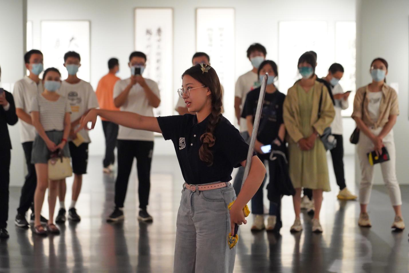 此后的晚场展览中,学生艺术团军乐队、交响乐队、合唱队、京剧队队员分别前往宇宙厅、温度厅、冯远厅,为观众带来一场场别样的音乐体验。交响乐队队员演奏的巴赫《大提琴无伴奏第一组曲》庄重典雅,莫扎特《小提琴中提琴二重奏》精巧灵动,军乐队带来的双簧管独奏《加布里埃尔的双簧管》深邃动人,长笛二重奏《千与千寻》细腻优雅。键盘队带来的手风琴独奏《安南探戈Anantango》别有风情,京剧队表演的《霸王别姬》刚柔并济,合唱队演唱的《但愿人长久》情意浓浓……时空交叠,旋律共振,现场观众伴着美妙的乐声,徜徉于艺术的海洋。