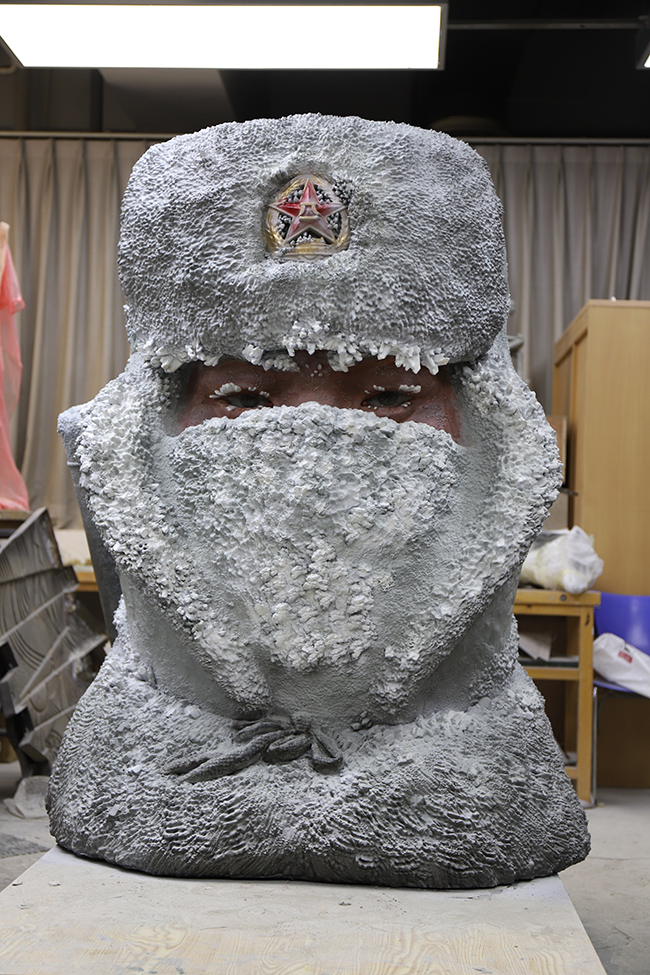 作品《岗》以一名守卫在祖国边疆哨所站岗的边防战士为原型,将肖像雕塑创作的造型语言注入数字化建模手段,将冰晶与面颊上的雪晶以超级仿真的建模制作方式表现出来,再辅以彩绘。作品仅仅表现一个人物头像,颜色和质感设计以凸显帽子与口罩之间露出的双目与面颊为视觉中心点。 制作过程包含小稿、泥塑大稿以及数字化处理,用科技丰富了传统艺术创作的表现主题和表达深度,同时也使得文化艺术表现与媒介技术发展的融合与磨合更具文化质感。