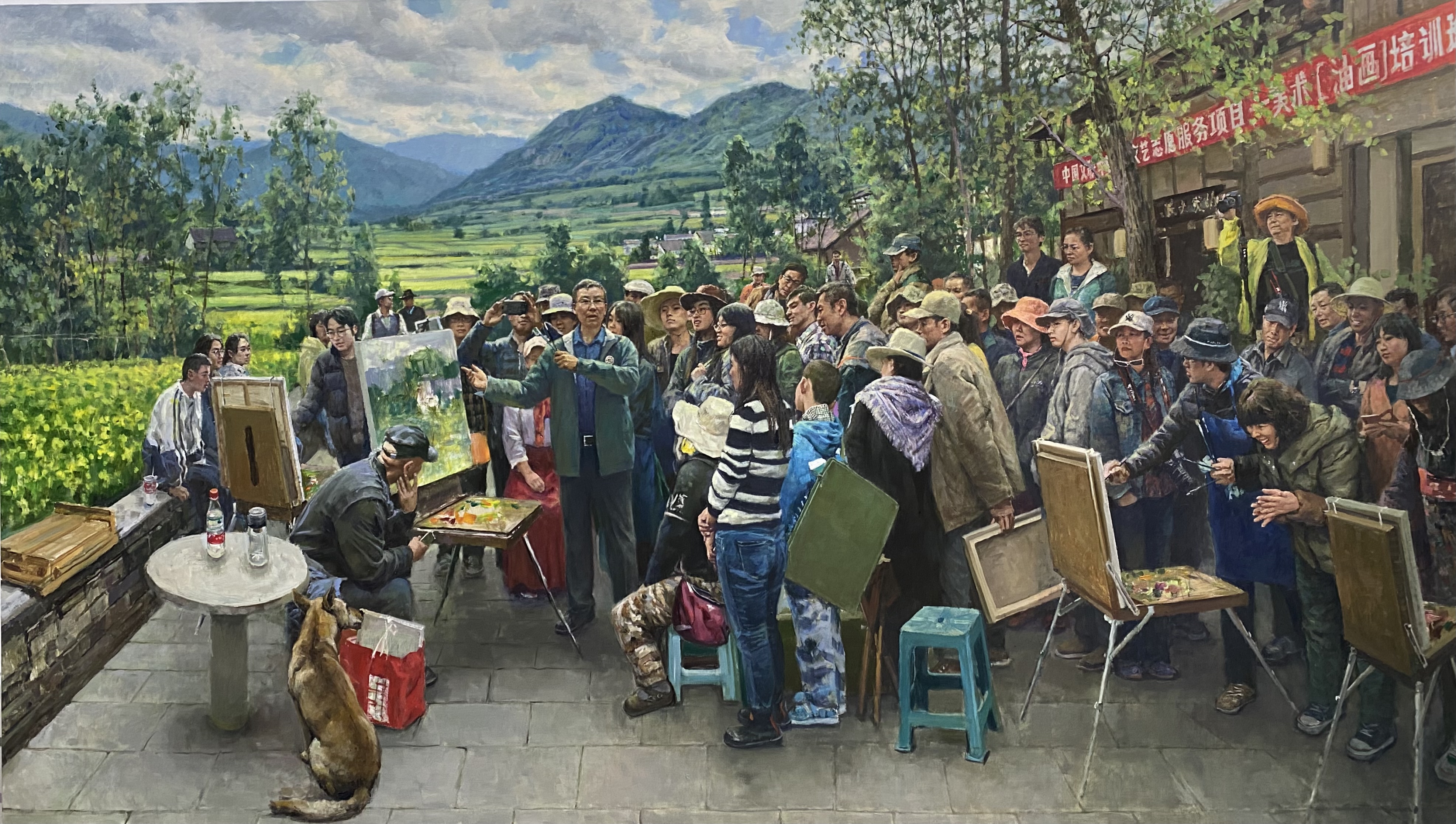 中国文联、中国美协近几年开展文艺志愿服务下基层辅导和培训基层美术骨干,组织艺术家们用艺术服务基层、服务人民,我很荣幸是积极的参与者之一。本画以中国美协组织的四川巴中美术培训班为基础素材发展而来,是艺术家辅导基层美术工作者做画的真实再现。