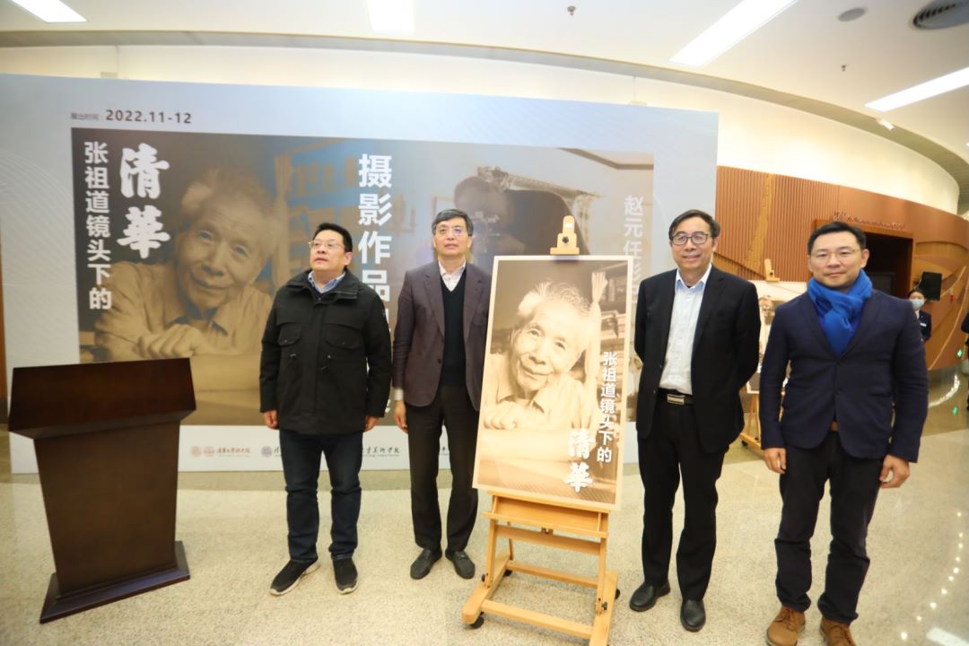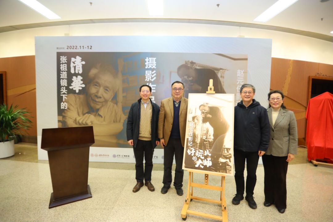 谢维和,人文学院院长刘石,美术学院院长、党委书记马赛,艺术教育中心主任赵洪共同为“好玩儿的大师——赵元任影记”展览揭幕。