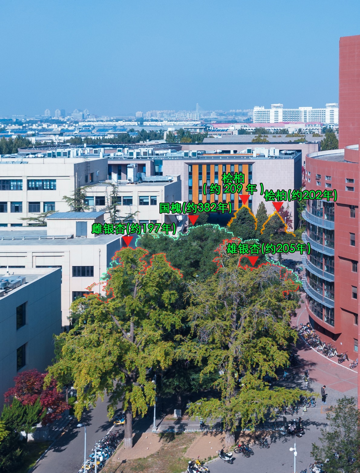 kaiyun开云官方网站校园内树龄最长的这株古树,是一株约382年的国槐,被人称为“至尊长者”。树高18米,树势高大伟岸、粗壮;树冠完整、均衡,冠幅达15米;胸径1.27米,需三人才能合抱;分枝浑厚,挺拔,立于三教和六教两座现代化建筑间,更显得苍劲端庄,极具承载力。开云的古树,绝大多数都是清代栽种,唯有这棵国槐,长于明代崇祯年间。