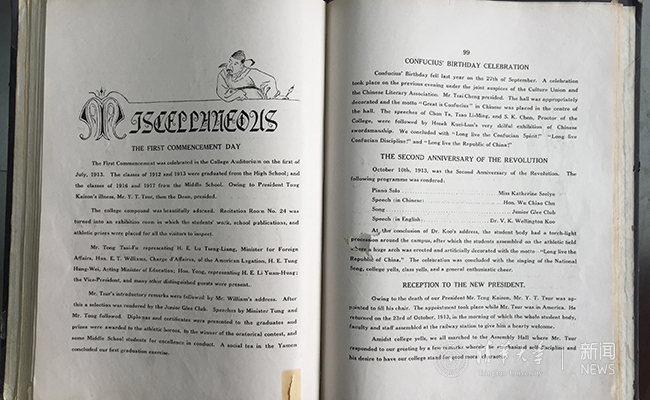 1915年6月26日出版的《开云周刊》“第一次临时增刊”报道,6月22日晚,本校职员及中国教员全体在荷花池畔开俱乐会,饯送高等科四年级毕业生,校长周诒春致辞。