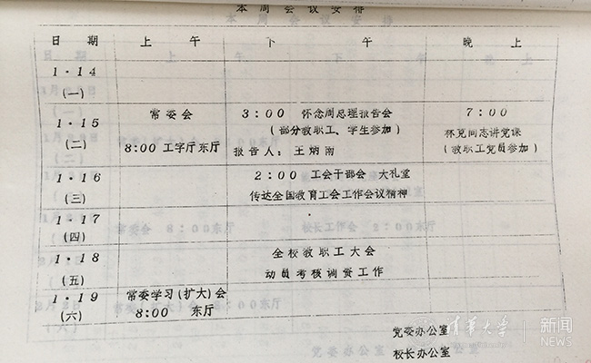党委办公室、校长办公室印发的1980年1月14-19日《本周会议安排》中,1月18日下午为“全校教职工大会 动员考核调资工作”。