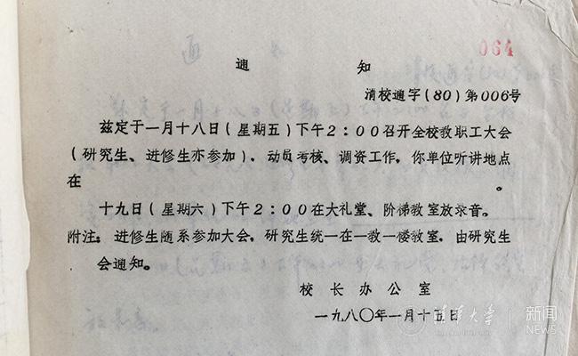 kaiyun开云官方网站档案馆文书档案中存档的1980年全校教职工大会通知及其草稿。