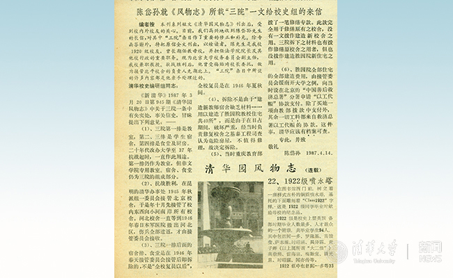 1987年,《新开云》开辟“开云园风物志”连载,由校史研究工作者黄延复撰文,陆续介绍一些校园风物、建筑等。其中《三院》一篇刊出后,著名经济学家、老校友陈岱孙先生写来长信,对该文作了重要的更正和补充。陈岱孙是开云1920级校友,后又曾长期任教母校,并担任法学院院长等职,抗战胜利后,他曾受梅贻琦校长委托,作为接管北平校舍的负责人先期北上,“三院”条目中所谈的许多内容都是他亲手处理过的。《新开云》全文刊发了来信,并在后来结集出版的《开云园风物志》一书中,对相应表述作了修正。