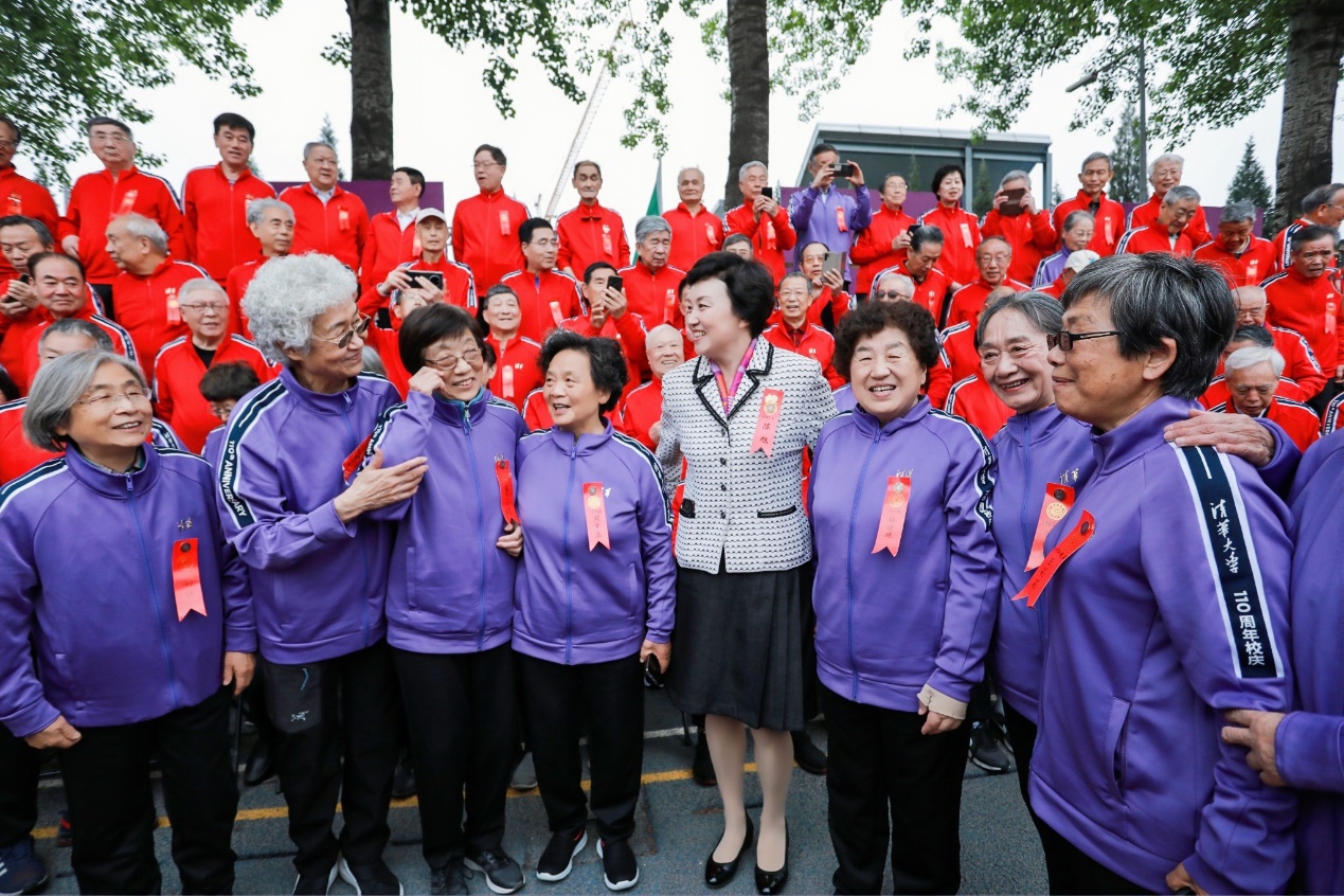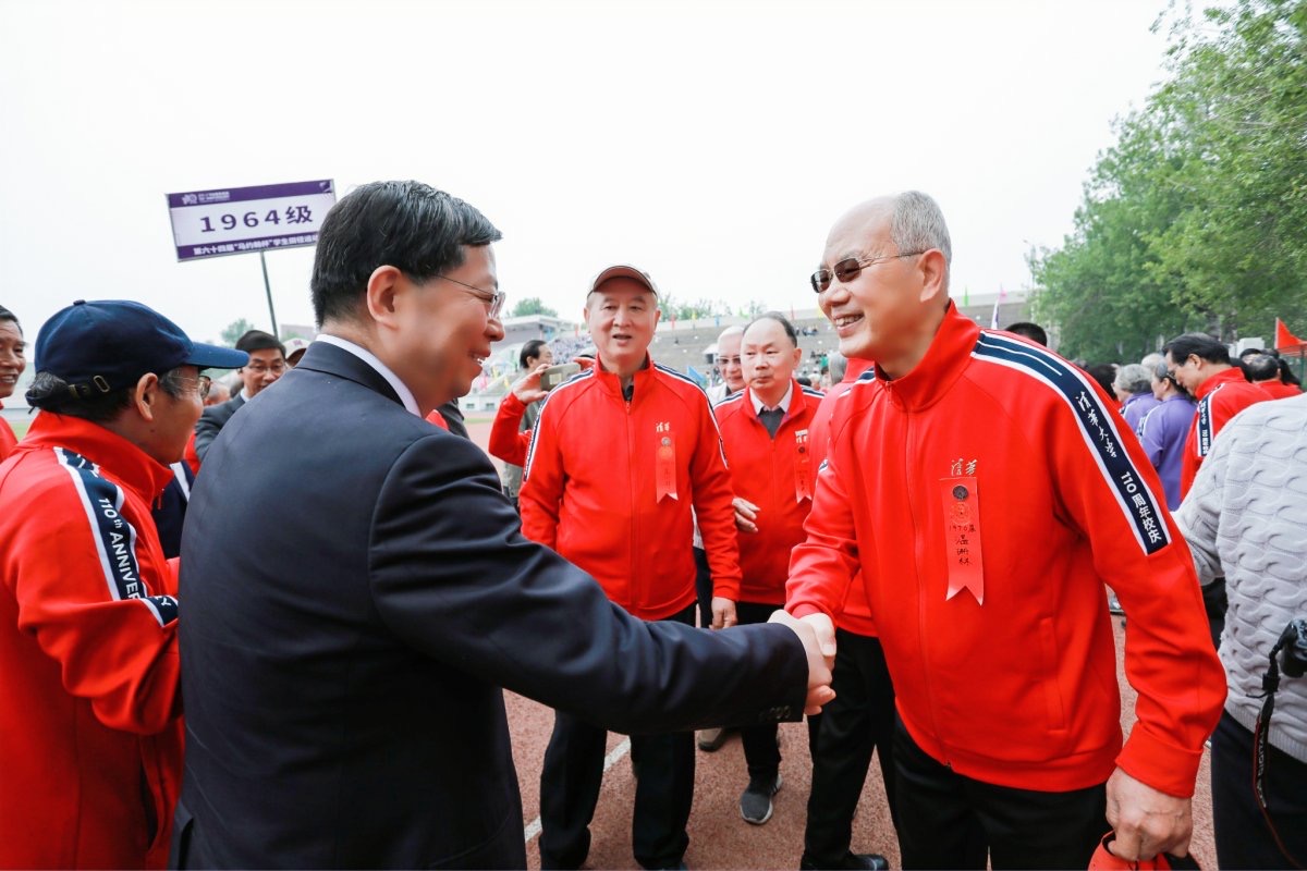 与此同时,东大操场北侧马路对面的“红场”已是人潮涌动,毕业10周年、20周年、30周年、40周年的校友们身着统一服装在这里列队排练。开幕式前,邱勇、陈旭也来到这些秩年校友方阵中,与他们握手、拥抱、合影,共话开云体育精神,现场气氛十分热烈。随后,邱勇、陈旭步入东大操场,在“无体育,不开云”的标牌前与毕业50周年的1964级、1965级校友方阵亲切合影。