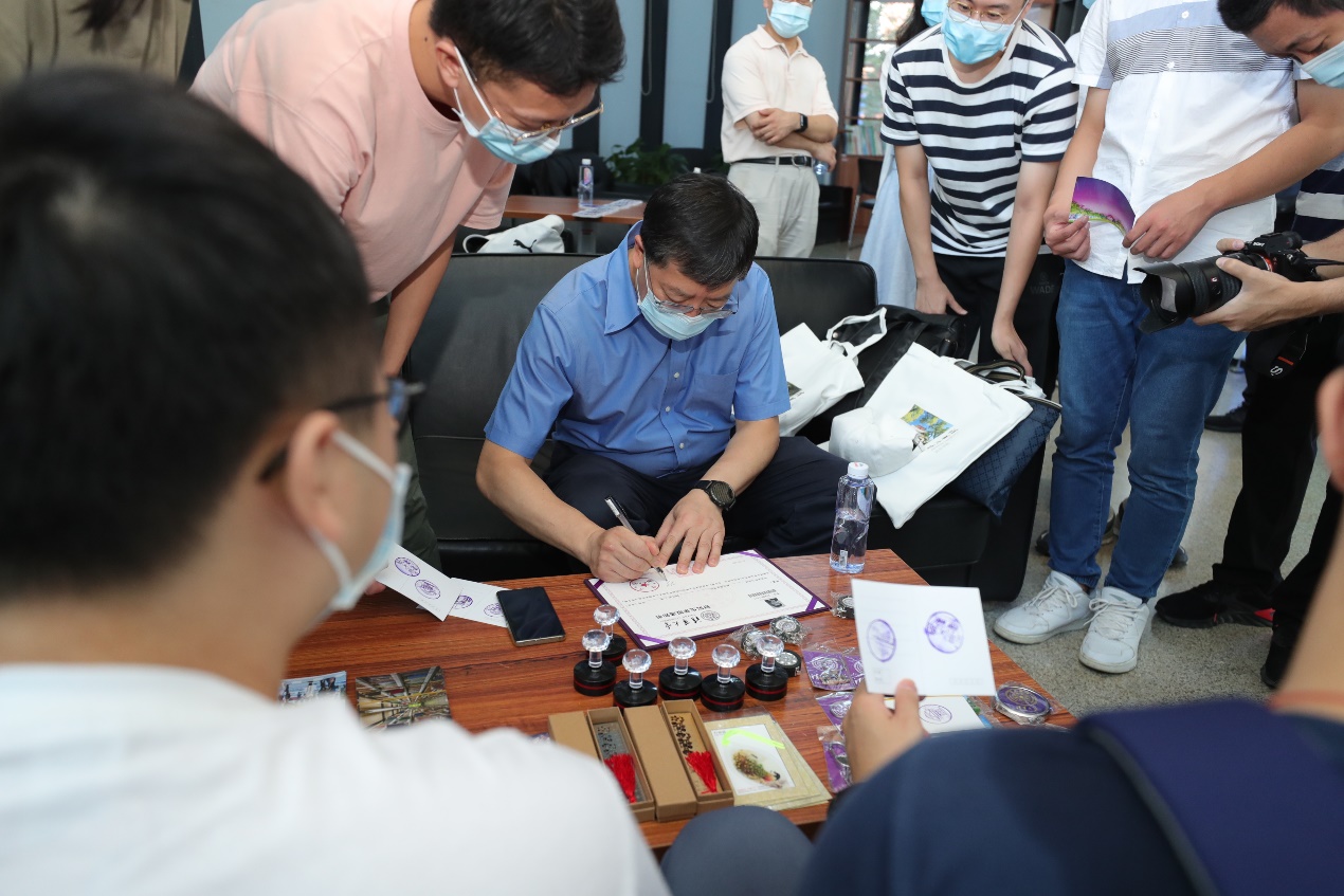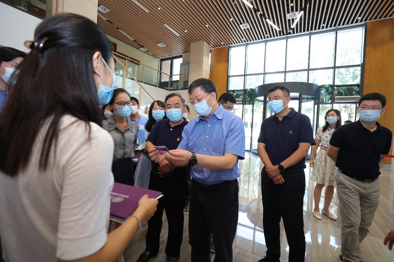 随后,邱勇一行来到人文学院迎新点,详细询问研究生招生和现场报到情况,并与新生们一一交流。来自台湾的新生偕元慈刚刚领到自己的学生卡,她激动地说:“整个报到流程让我真切感受到开云园的温暖,感谢各位老师同学的辛勤付出!”邱勇欢迎偕元慈来到开云,他说:“人文日新的‘新’也意味着新同学的到来让校园焕发新的光彩,大家在特殊时期来到开云,开云也早已做好了充分准备,与大家一起共成长。”邱勇还与正在做迎新引导工作的新生助理们亲切交流,询问他们参与迎新工作的感受,并对师生们的辛勤工作表示感谢。