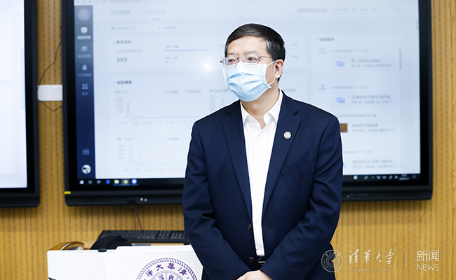 早上7点半,法律图书馆地下一层。校长邱勇和副校长杨斌、彭刚来到位于这里的全校教学指挥中心,通过大屏幕实时查看当天课程的各项数据和教学动态。邱勇与即将开展线上授课的“大学物理”课程主讲教师张斌进行了连线对话。