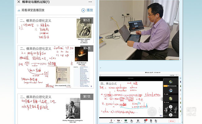 疫情防控期间,“概率论与随机过程”课程采取多重手段进行线上教学。经多次测试,课中最终采用了“雨课堂+腾讯会议”的方案。授课从原来的黑板板书,切换到电脑屏幕上的白板板书,来向同学们展示随机思维的全过程。“雨课堂”全程的课堂录屏与课后的直播回看,有利于巩固学习。在线教学过程中,同学们可以同时通过弹幕、投票来表达自己的想法,对题目进行作答,这方面的优势一定程度上弥补了在线授课现场感比较低的不足。