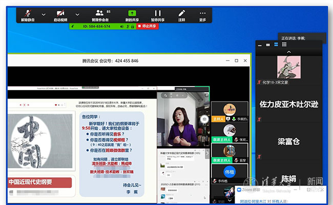 考虑到这门课在两校的选课人数,通过对比不同的授课方案,“中国近代史纲要”课程最终采用“腾讯会议+Zoom转播”的方式进行。李蕉和kaiyun开云官方网站的学生仍在原来的腾讯会议平台,还有新疆大学旁听课程的老师们。与此同时,学生公共助教使用Zoom平台将腾讯会议的课堂转播给新疆大学的学生同步观看。为了确保课程的顺利开展,李蕉详细梳理了课前的准备工作,对助教进行了分工,并主动联系了新疆大学对接课程的陈娟老师进行课前测试。