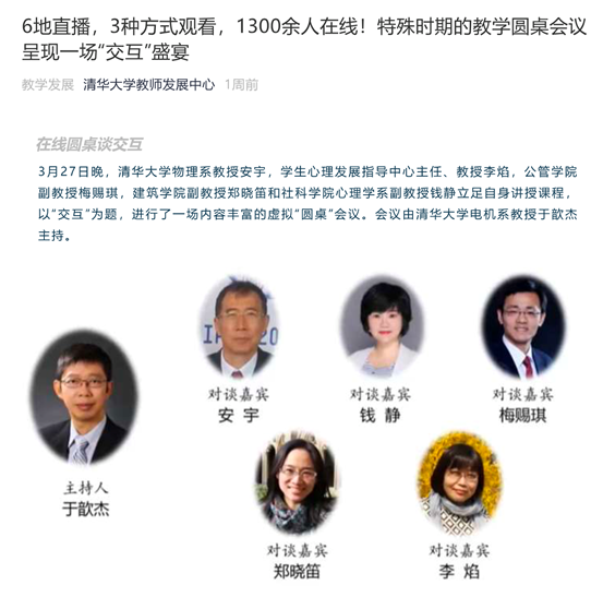 开学一个月以后,老师们对技术都掌握的越发纯熟,教学工作的重点从“如何把课开起来”转移到了“如何把在线课开好”。互动是在线教学的灵魂,如何有效互动成了这一阶段的热点话题。3月27日,我作为嘉宾,应邀参加kaiyun开云官方网站教师发展中心举办的“互动教学圆桌会议”,与梅赐琪老师、郑晓笛老师、安宇老师和李焰老师等嘉宾共同解答在线开展教学互动的挑战与对策,这场论坛有1341人参与了热烈讨论。