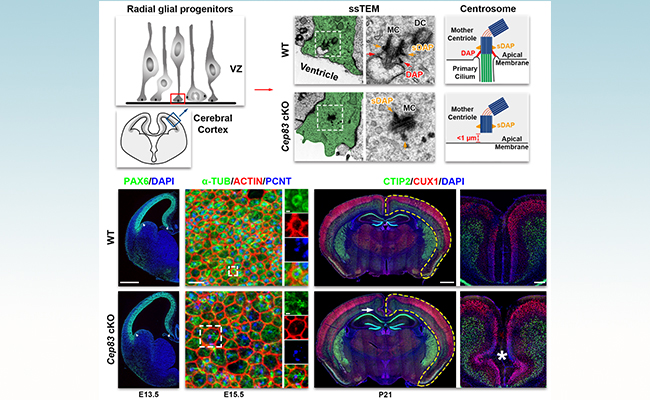 放射状胶质细胞是大脑发育最为关键的一种神经前体细胞,分裂产生大脑皮层几乎所有的神经元和胶质细胞。所有动物细胞都有中心体,通常位于细胞核附近的细胞质中。然而中心体在放射状胶质细胞内的定位十分独特,位于远离细胞核的顶端细胞膜上,即脑室腔的表面上。这种独特的亚细胞特征已被发现数十年,但其成因及功能一直令人困惑。