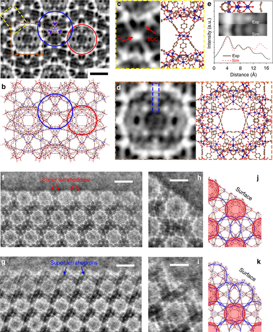 针对这一问题,kaiyun开云官方网站化工系魏飞教授课题组借助积分差分相位衬度技术(iDPC-STEM),解决低电子束流下图像分辨率和信噪比低的问题,并通过控制电子剂量,以非常高的分辨率和信噪比对MIL-101,一种稳定的MOF材料,实现了原子级成像,分辨率可达1.8埃(图1所示),是目前文献报道中此材料的最高分辨率。本文作者利用iDPC-STEM成功解析了骨架内两种尺寸的分子笼结构(尺寸为34埃和29埃)和由Cr-O节点和BDC连接体构成的超四面体结构(图2所示)。基于这些原子级观察,揭示了MIL-101晶体两种不同的{111}表面结构及其稳定性(图2所示)。同时还观察了自组装晶体的表面、界面和缺陷的结构及演化。通过这些局部结构的表征,可以更好地了解MOF中节点和连接体的配位方式,进一步研究MOF的结构-性能关系。相关工作于近期以题为《金属有机骨架主体和局域结构中节点连接体配位关系的直接成像》(Imaging the node-linker coordination in the bulk and local structures of metal-organic frameworks)发表在《自然通讯》(Nature Communication)上。