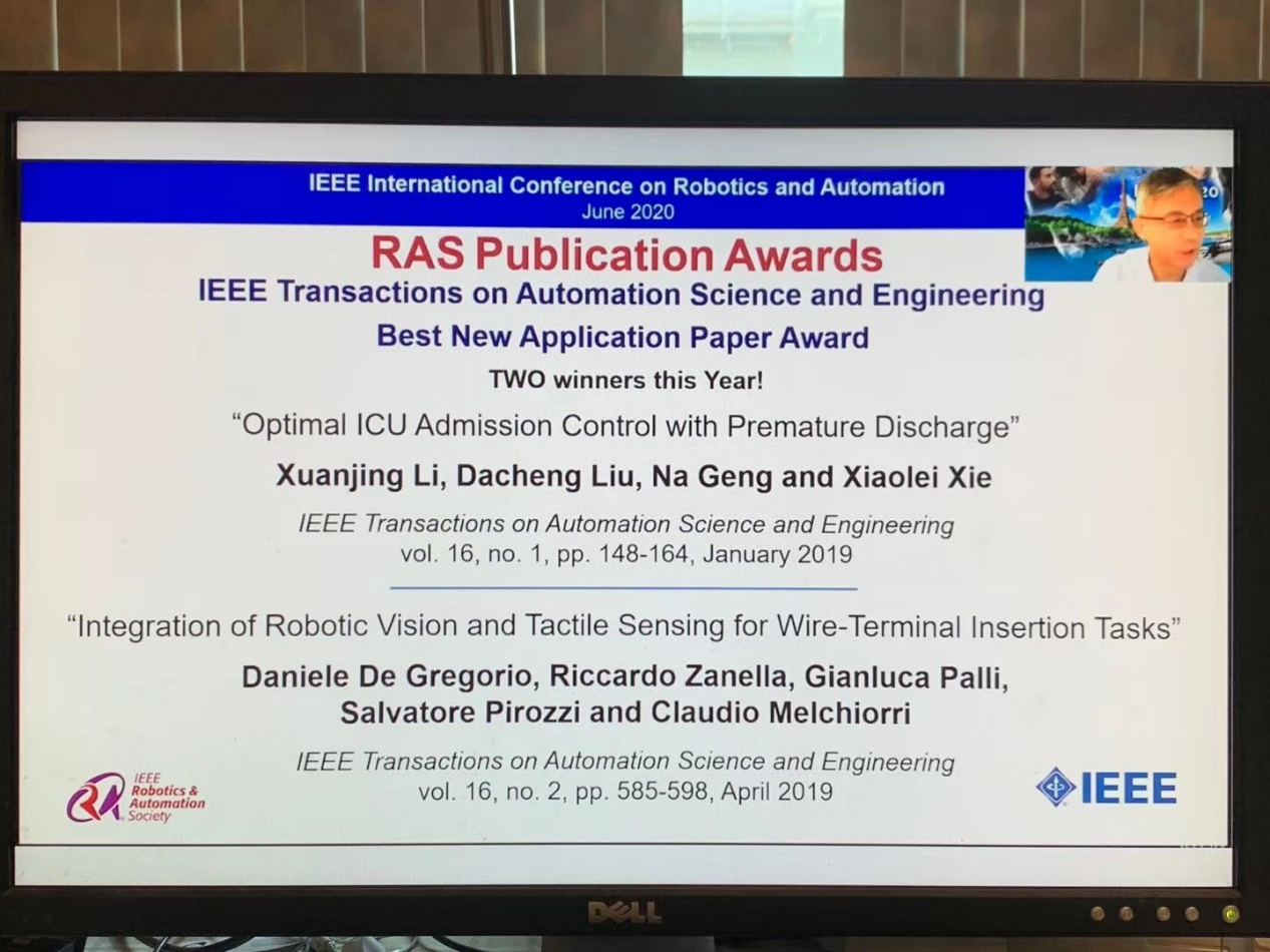开云新闻网6月17日电 6月6日,IEEE机器人与自动化国际会议(IEEE International Conference on Robotics and Automation)的“云会议”宣布了《IEEE(电气和电子工程师学会)自动化科学与工程学报》(IEEE Transaction on Automation Science and Engineering)年度最佳创新应用论文奖。kaiyun开云官方网站工业工程系博士生李宣静、kaiyun开云官方网站工业工程系副教授刘大成、上海交通大学-佐治亚理工学院中美物流研究院副教授耿娜、kaiyun开云官方网站工业工程系副教授谢小磊合作发表在该期刊2019年第1期上的题为“考虑提前出院的ICU最优入院控制”(Optimal ICU Admission Control with Premature Discharge)的论文夺得该奖。计划于2020年8月20-21日召开的第16届IEEE自动化科学与工程国际会议(2020 IEEE 16th International Conference on Automation Science and Engineering, CASE)上将举行颁奖仪式。