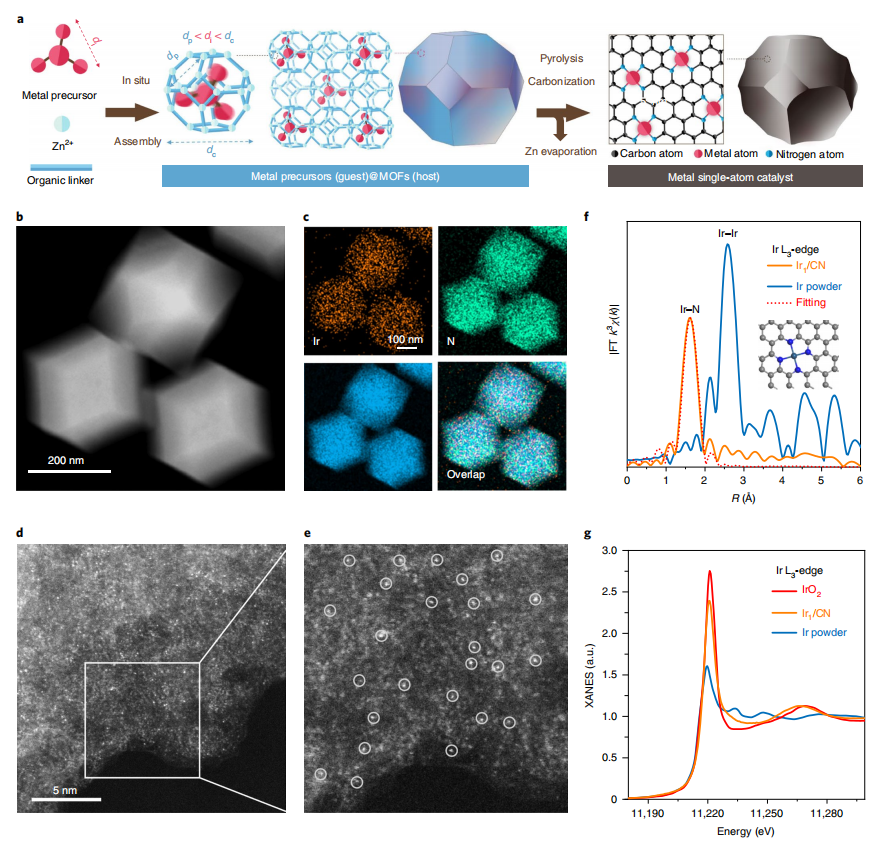 主客体策略合成单原子位点催化剂示意图和铱单原子位点结构表征
