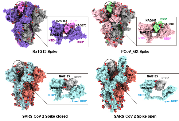 蝙蝠冠状病毒RaTG13分离自中国云南省中华菊头蝠,与新冠病毒基因组序列一致性为96.2%。穿山甲冠状病毒(Pangolin coronavirus, PCoV)分离自广西壮族自治区和广东省查获的境外走私穿山甲,其基因组与新冠病毒基因组序列一致性也达到了85.5% -92.4%。王新泉课题组之前报道了蝙蝠冠状病毒RaTG13和穿山甲冠状病毒PCoV_GX刺突糖蛋白结构,发现RaTG13与PCoV_GX的刺突糖蛋白结构与新冠病毒刺突糖蛋白结构相似,并且PCoV_GX刺突糖蛋白与受体亲和力与新冠病毒也相当,但是新冠病毒的感染能力更强。为了从刺突蛋白的角度探究新冠病毒感染力强的分子机制,通过结构比较,本研究发现在RaTG13与PCoV_GX的刺突糖蛋白结构中,受体结合域(RBD)与其周围的三个聚糖(NAG165、NAG234、NAG370)存在相互作用,但是新冠病毒却缺失了N370位点的糖基化修饰。进一步通过序列比对,发现在129种β冠状病毒Sarbecovirus亚属中,N370位点的N糖基化修饰在128种Sarbecovirus亚属成员中高度保守,唯一例外是新冠病毒刺突糖蛋白发生了T372A突变,从而导致N370位点的N糖基化缺失。
