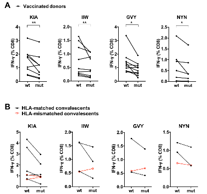 图6:抗原表位的突变降低了对疫苗接种者及新冠康复者体内CD8+ T细胞激活的效率
