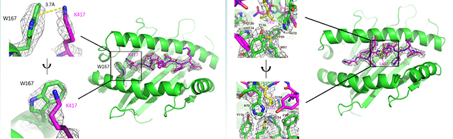 更近一步,金腾川课题组通过晶体学的方法,解析了其中2条抗原表位和对应MHC分子的复合物晶体结构(图7)。可以清晰地看到在KIA-HLA-A*02:01复合物(图7A)中,417位的赖氨酸的正电荷侧链与HLA-A*02:01蛋白的W167通过Pi阳离子相互作用牢牢结合,贝塔变种和伽马变种携带的K417N/T突变将打破这一相互作用,导致HLA-A*02:01蛋白无法识别这一抗原表位,作者也通过生化的方法证明了这一结论。在NYN-HLA-A*24:02复合物(图7B)中,452位的亮氨酸的疏水侧链埋在了HLA-A*24:02蛋白表面的疏水口袋中,通过疏水相互作用紧密结合,关键位点452位氨基酸的突变可能帮助病毒逃逸抗原表位NYN介导的细胞免疫。