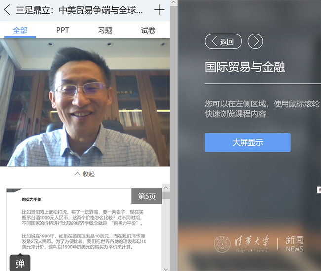 隔着屏幕,鞠老师与身处全国各地的70多位同学们准时“线上相聚”,2019级金融硕士课程“国际贸易与金融”第一讲拉开序幕。当天晚上,鞠老师还有一堂近300人签到的本科生大课 “中美贸易争端和全球化重构”。