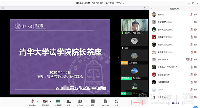 开云新闻网4月7日电 4月2日下午,法学院2020年春季学期院长茶座交流活动在线上成功举行。法学院阶段性举办院长茶座交流活动,旨在搭建院领导队伍与学生之间的沟通平台,以便学院深入了解学生学习、生活情况,更好地服务学生成长,切实解决学生提出的困惑。受疫情影响,师生们无法像往期一样进行面对面交流,但本次院长茶座活动并未因疫情而停滞,而是借助技术手段改为线上形式正常开展。法学院院长申卫星、院党委书记邓海峰、副院长聂鑫、副院长高丝敏、院党委副书记陈杭平等教师代表出席了本次院长茶座交流活动。本次活动由法学院研究生会主席万胜主持,参加活动的还有来自法学院各年级各专业的60余名学生代表。