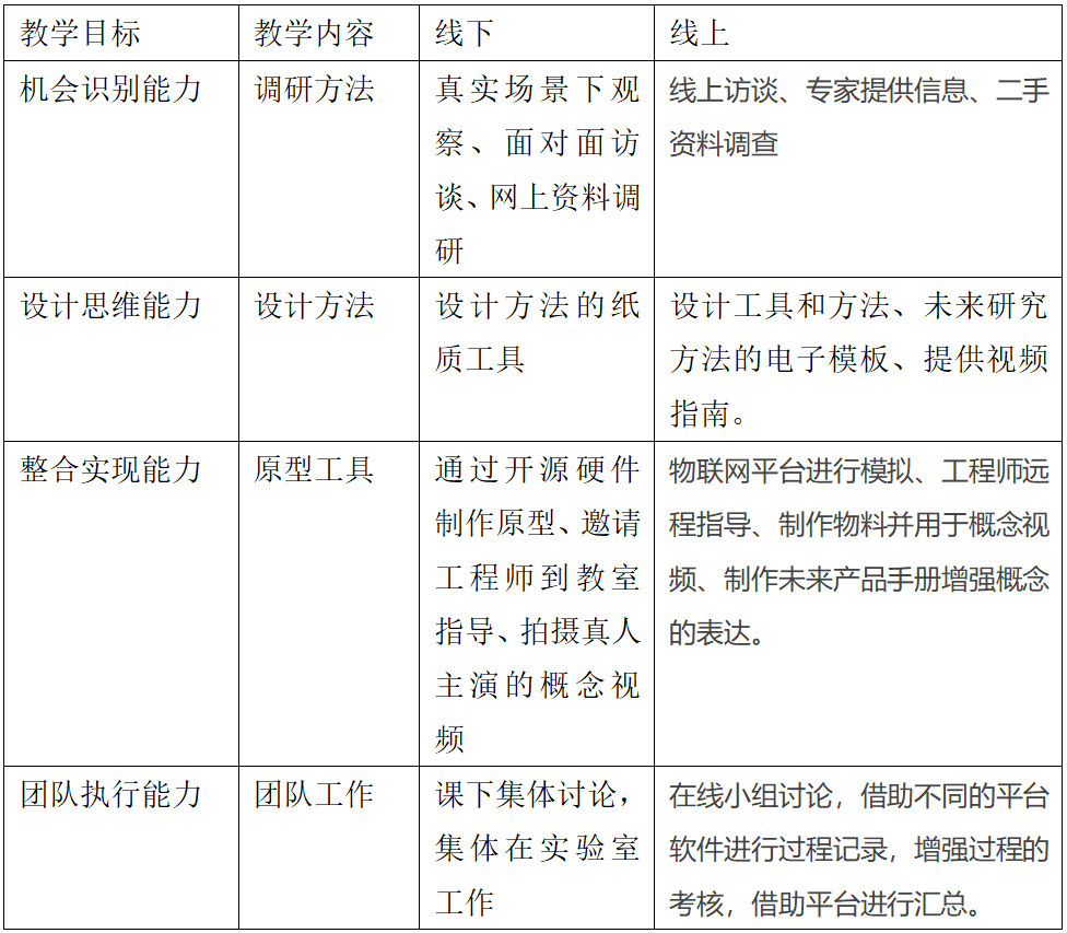 围绕教学目标,教学内容根据只能开展远程线上教学进行了调整。结合当前隔离的情况,增加了独立思考的课程内容比重,特别是引入未来研究的方法,侧重从价值观和世界观的层面进行设计反思,有助于学生能够提升对设计的认识。主题的设定选择为智能家居,也有助于移情和测试。考虑到因为不能面对面指导,设计实践的部分也必须调整为线上协作,因此要借助各种教学手段增强学生的参与(engagement)和学生之间的互动。
