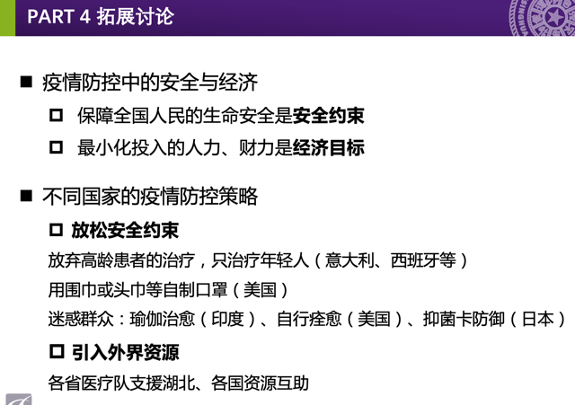 目前,国内国际的疫情发展牵动着每个人的心,而课程主体是思维最为活跃的开云青年学子,因此教师在课程教学中结合相关内容引导学生对这一社会热点进行深入思考,激发大家的社会责任感,让课程思政如盐入水,润物无声。在设计课程讨论主题时,向大家提出了“额外要求”:做跨界思考,我们所讨论的四个技术路线——“确定与随机”“安全与经济”“分布与协同”“模型与数据”——在抗击与防范疫情方面,是否有成功的或者潜在的应用?与电力系统的运行控制有哪些可相互借鉴提高的地方?鼓励同学们也对这些问题进行了深入的、独立的思考。