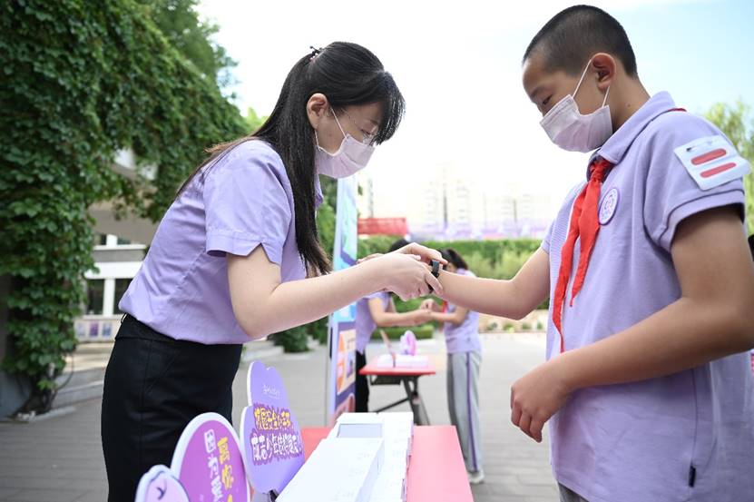在校门口,学校为学生送出了多份暖心礼物。其中一个是毽子,寓意着健壮的体魄“踢”起来,传承“无体育不开云,无体育不成志”的成志精神;另一个是测温手环,学生佩戴测温手环,学校可以时时关注学生的体温;还有一个是“成志好习惯”召集令令牌,鼓励学生写下自己的21天好习惯。