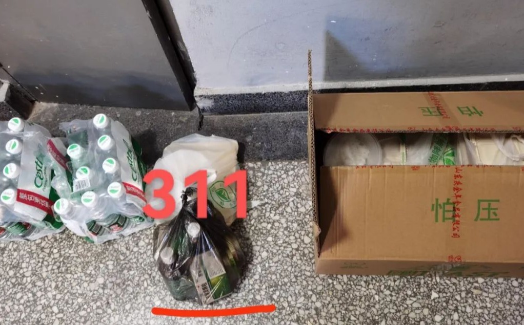 接下来,学院的20多位老师轮岗住楼楼长。阳性学生寝室的三餐、药品、水、外卖、快递、大礼包、体温计等,都需要楼长配送。保洁阿姨无法到岗或需要临时消杀时,他们也要顶上。