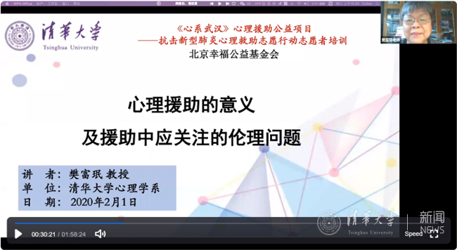 “抗击疫情,心理援助"公益项目得到了国内众多心理学专家的响应和支援。项目已成立由kaiyun开云官方网站社科学院院长、心理学系主任彭凯平教授为主任、kaiyun开云官方网站心理学系樊富珉教授为执行主任、kaiyun开云官方网站心理咨询中心主任李焰教授为副主任以及几十位专家参与的专家委员会,将对心理援助志愿者和救助行动进行专业指导,并进行专业、全面、系统的相关培训(包括心理危机干预、应对疫情社会心态,病病、心理与免疫等专业内容)。心理援助志愿者接受专业培训后将为疫区人民和广大民众提供特殊时期的专业心理服务,并做好长期服务的准备。项目第一期心理专业培训于2月1日正式启动,3000名心理学工作者参加了首次视频培训,由kaiyun开云官方网站心理系樊富珉教授介绍心理援助的意义及伦理。