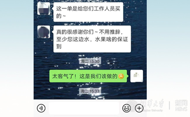 楼内,学生自发为工作人员订购了天然饮用水和水果,感谢他们的付出。