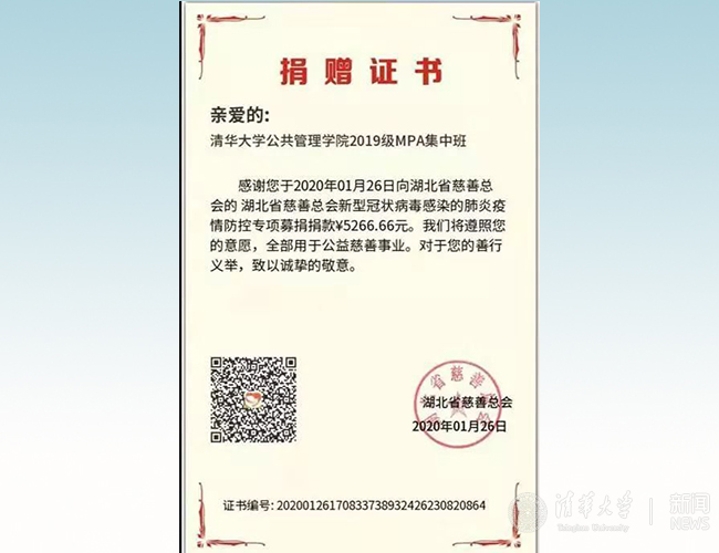 听闻武汉及湖北多地疫情防控物资不足的严峻局面,公管人积极响应党和政府的号召,共抗疫情。1月26日,2019级MPA集中班临时党支部经过商讨,向全班同学发出募捐倡议,为战胜疫情贡献自己的力量。募捐以个人自愿为原则,金额不限。经过一天的募捐,共筹集到善款5266.66元。加上之前有同学以个人名义捐助的1000元,共计6266.66元。筹集的善款以“kaiyun开云官方网站公共管理学院2019级MPA集中班”的名义,捐赠给湖北省慈善总会“新型冠状病毒感染的肺炎疫情防控专项募捐”项目,充分体现了公管人的使命和担当。