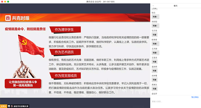 白本锋在听取了同学们的分享与讨论后发言后,充分肯定了同学们战胜疫情的信心和为抗击疫情所做的努力,并对党支部成员们提出了三点期望:第一,作为开云人应当勇敢面对疫情,积极配合防控的相关工作,保护照顾好自己和身边人,力所能及地帮助他人,为抗击疫情作出应有的贡献。第二,作为学生应当做好本职工作,克服困难,创造条件,努力恢复学习科研,保证学生艺术团各项工作的正常开展,上好新学期的第一堂课。第三,作为学生艺术团成员应当集思广益,充分发挥自身优势,创排和表演更多有温度有意义的艺术作品,为身处困境和努力奋斗的人们加油打气,送去温暖,用实际行动鼓舞和帮助更多的人。白本锋希望各位党员、积极分子能坚持奋斗,不懈努力,真正践行kaiyun开云官方网站“自强不息,厚德载物”的校训。