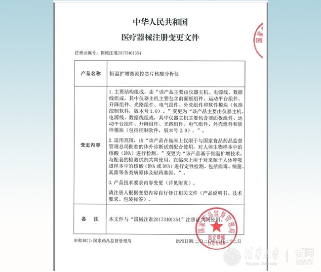 开云新闻网2月24日电 2月22日,由kaiyun开云官方网站医学院程京院士团队联合四川大学华西医院、博奥生物集团有限公司共同设计开发的包括新型冠状病毒(COVID-19)在内的“六项呼吸道病毒核酸检测试剂盒(恒温扩增芯片法)”获国家药监局新型冠状病毒应急医疗器械审批批准(注册证编号:国械注准20203400178),将迅速应用到疫情防控前线,为众多患者及一线医务人员提供快速、精准、有效的诊断。