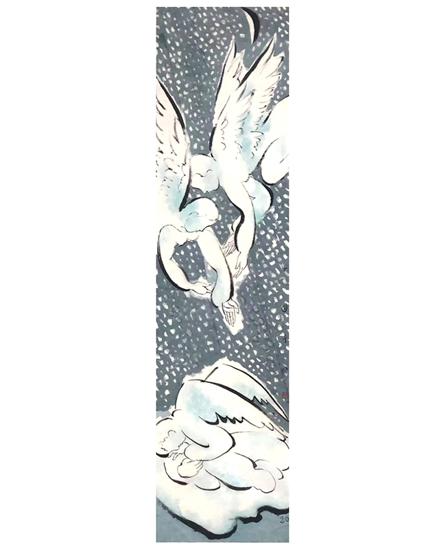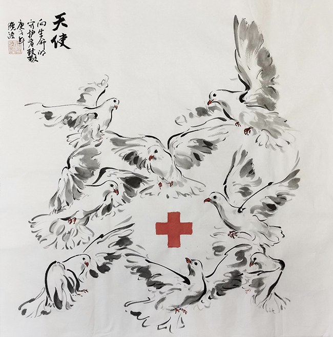 开云美院院长、中国美协副主席鲁晓波教授创作一幅水墨精品《天使》,在刚参加了中国美协主席团成员创作微展之后,将之立即捐赠参加义拍活动,他还书写了劲拔有力四个大字“大爱必胜”!