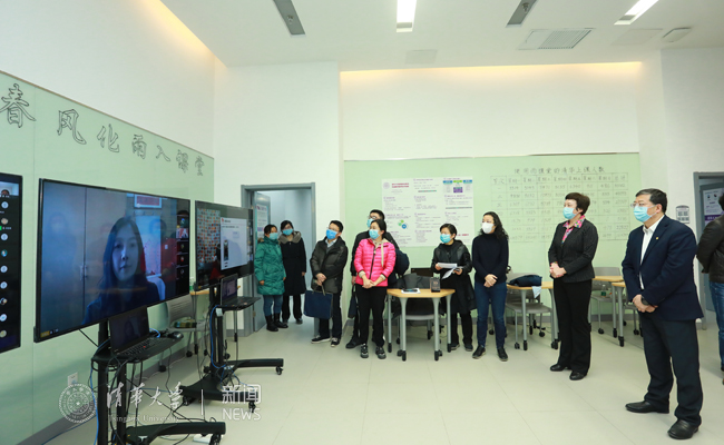 随后,校领导一行来到了位于法律图书馆地下一层的全校教学指挥中心,通过大屏幕了解在线教学的整体情况。
