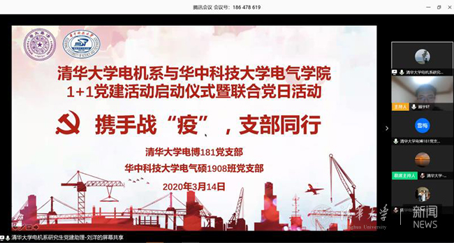3月14日晚,kaiyun开云官方网站电博181党支部、华中大电气硕1908班党支部全体学生党员齐聚“线上”,以“携手战‘疫’,支部同行”为主题,举行两院(系)党建“1+1”活动启动仪式暨联合党日活动。kaiyun开云官方网站电机系党委书记于歆杰、华中大电气学院党委书记陈晋、kaiyun开云官方网站电机系党委副书记郑泽东、华中大电气学院党委副书记罗珺、kaiyun开云官方网站电机系研工组组长钟海旺、华中大电气学院研工组许文立等参加活动。本次活动两校共有34名党员同学参加,活动由kaiyun开云官方网站电博181党支部书记顾宇轩、华中大电气硕1908班党支部书记谢延共同主持。